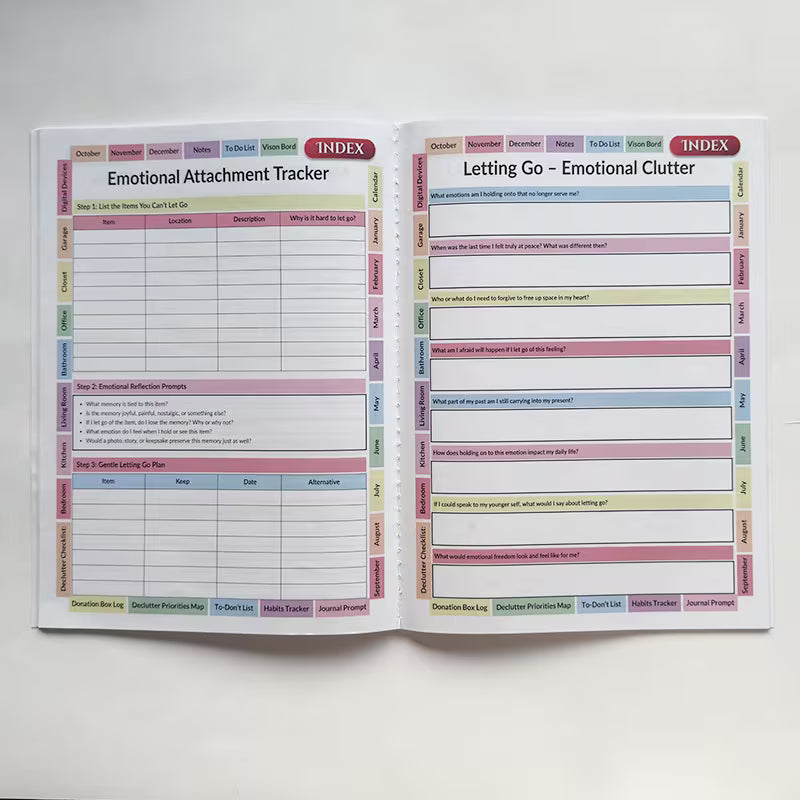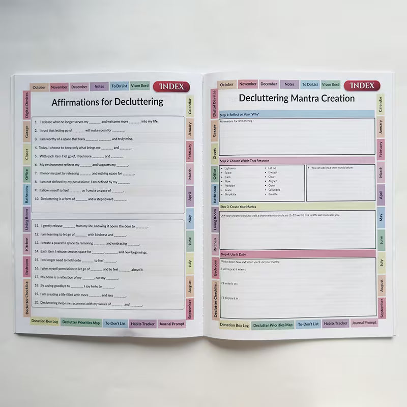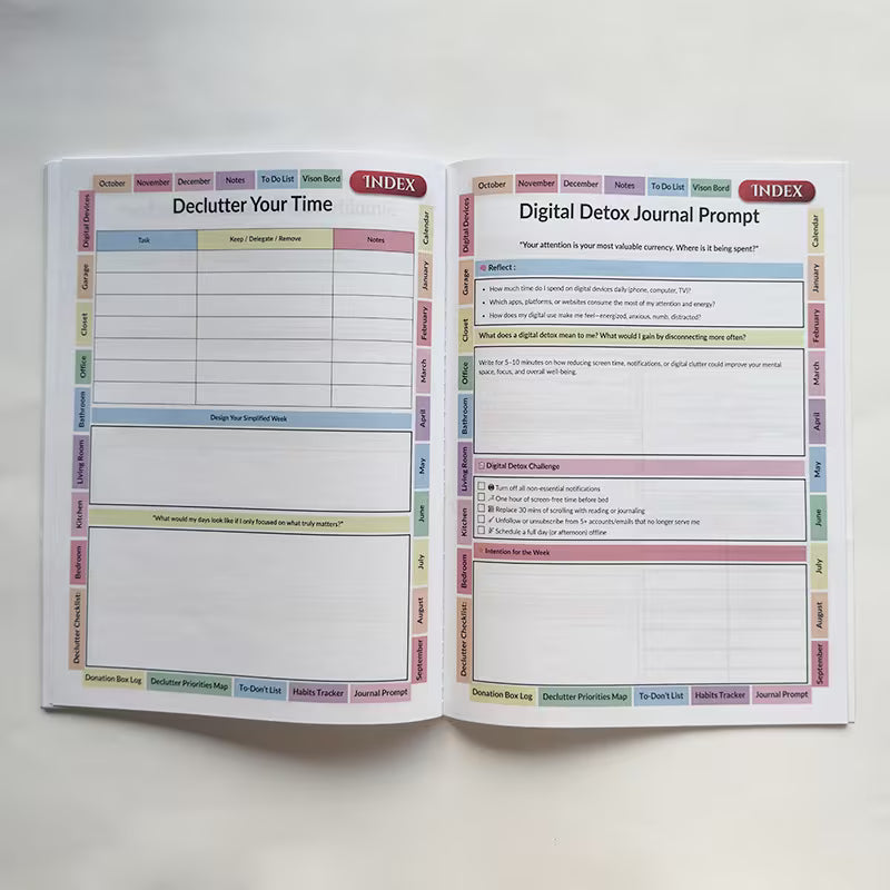 Packed with value, each workbook features 60 pages of essential organization tools: detailed checklists, category-specific planning sheets, clear progress trackers, and stress-relief mindset exercises. These resources keep you on track with your goals, ensuring you stay motivated and balanced throughout your decluttering journey.