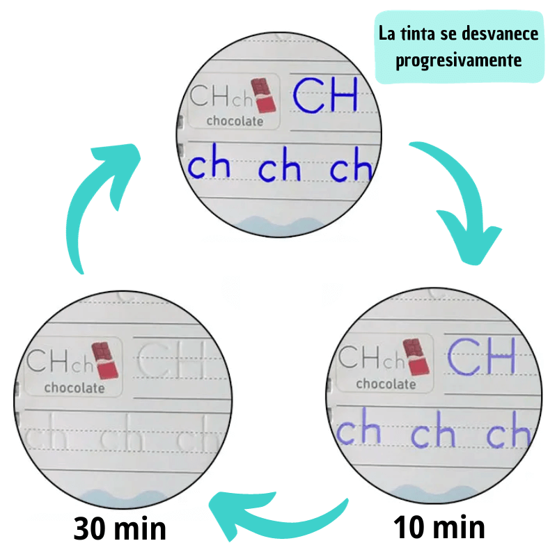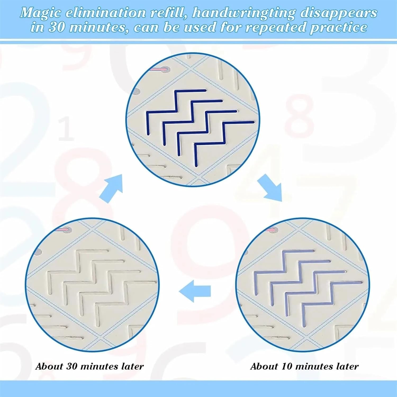 Magic Spanish calligraphy book disappears automatically after drying after a few minutes, you don't need to do anything to reuse it, allowing children to practice again and again to perform good writing. Each pack includes 1 fountain pen and 5 ink refills, children can use for long term. With constant practice, the capacities of concentration and patience are developed.