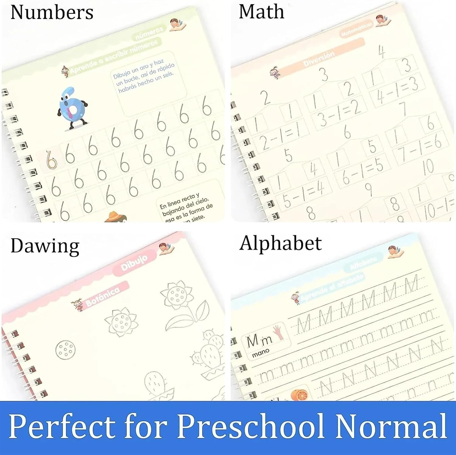 A: The set comes with 4 spiral-bound copybooks (Alphabet, Numbers, Math, Drawing), 1 erasable pen, 10 replacement refills, and 1 soft eraser. Everything your child needs to start learning is included, so no extra purchases are required.
