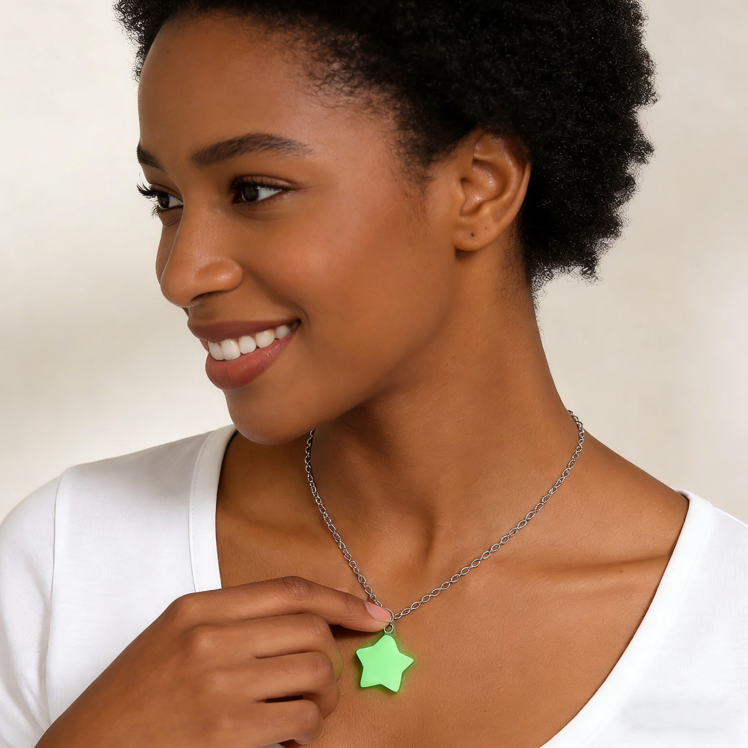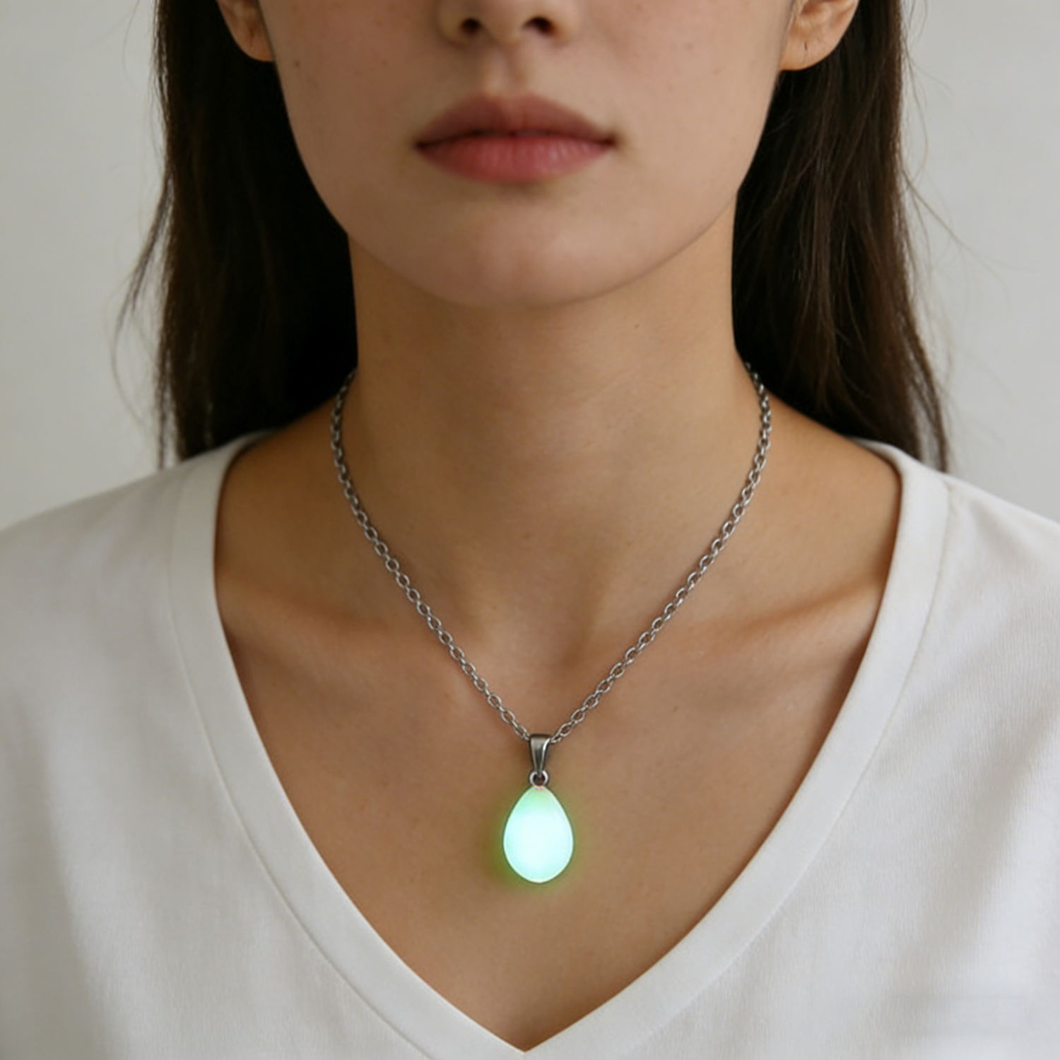 Crafted with high-grade photoluminescent resin, the pendants effortlessly absorb natural sunlight and soft indoor light throughout the day with zero extra steps or tools. When the lights dim, they release a gentle, dreamy green glow that lasts for hours, casting a subtle and whimsical luminescence around your neck. The more bright light the pendant soaks up, the more vivid and long-lasting the dark glow becomes, bringing a touch of understated magic to evening outings, late-night hangouts and everyday moments with complete ease.
