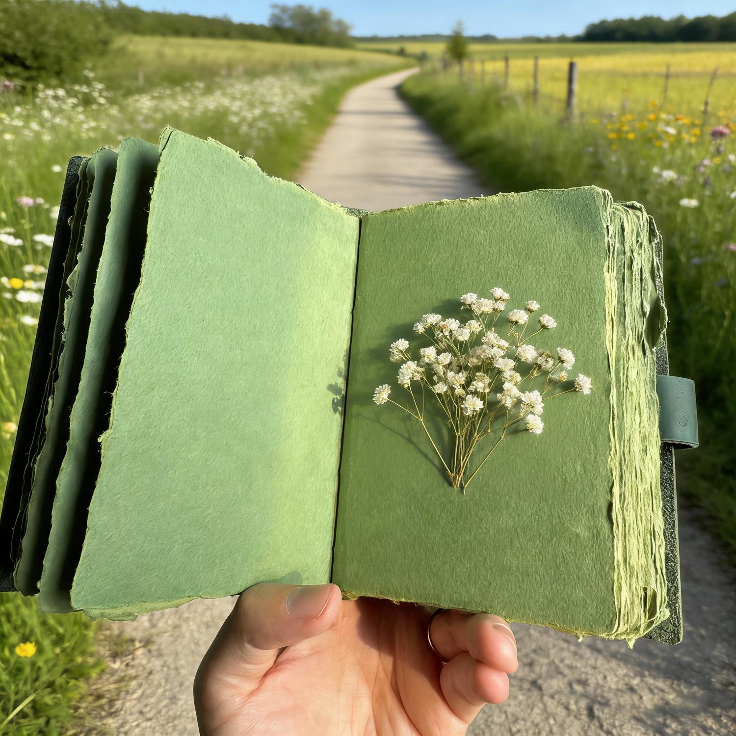 This is a handmade DIY green paper journal crafted from thick, textured, rough-edged paper. It’s designed to be a blank canvas for your creativity—whether you want to press flowers, write poetry, sketch, or preserve memories. The journal does not include the dried flowers shown in the image, allowing you to fully customize it to reflect your unique style.