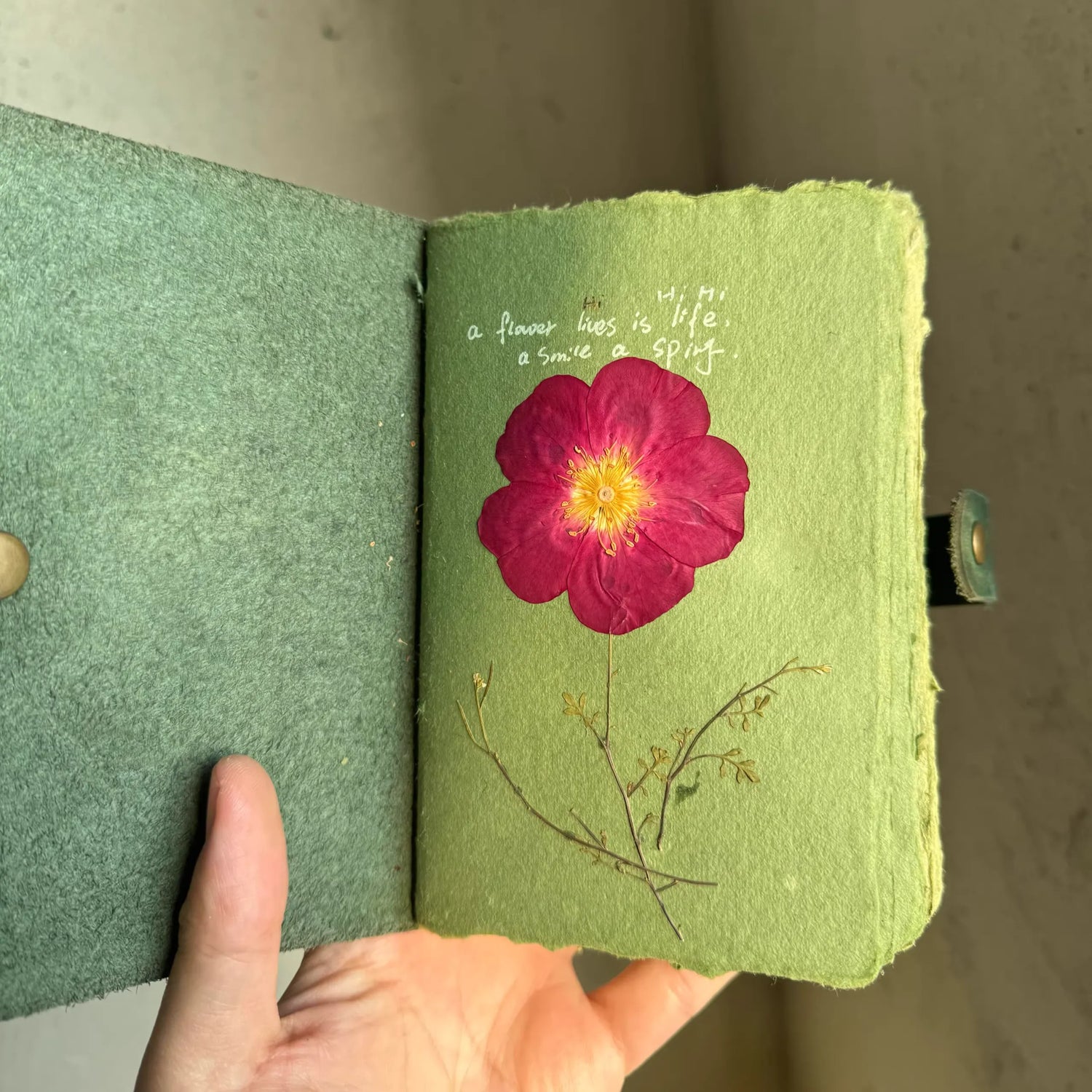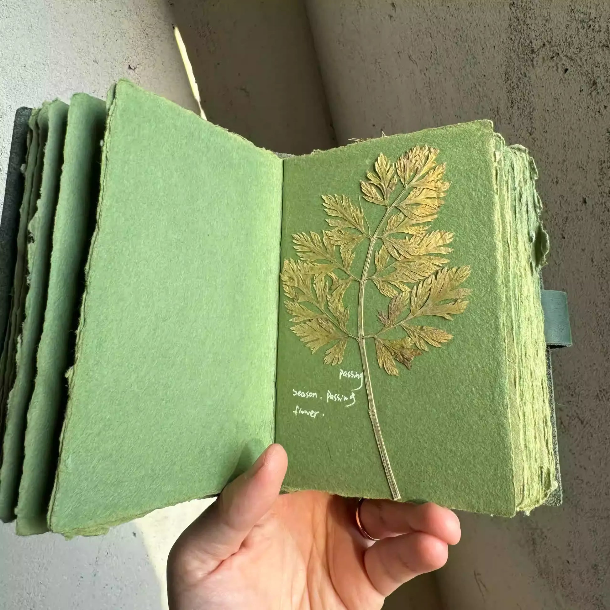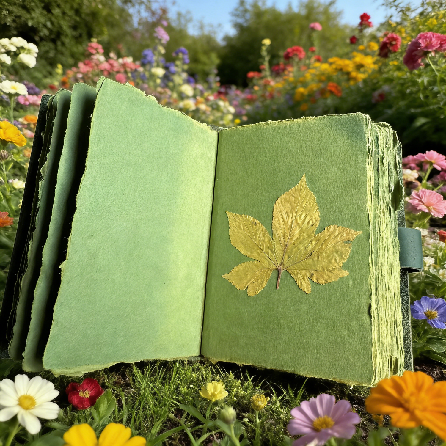 Crafted from heavyweight, textured green paper with a soft, felt-like finish, this journal is designed to handle a wide range of creative mediums. The thick stock prevents ink bleed-through, making it perfect for fountain pens, watercolors, sketching, and even pressing delicate items like flowers, leaves, or small mementos. The rich, earthy green hue provides a calming, natural backdrop that makes your writing and art stand out beautifully.