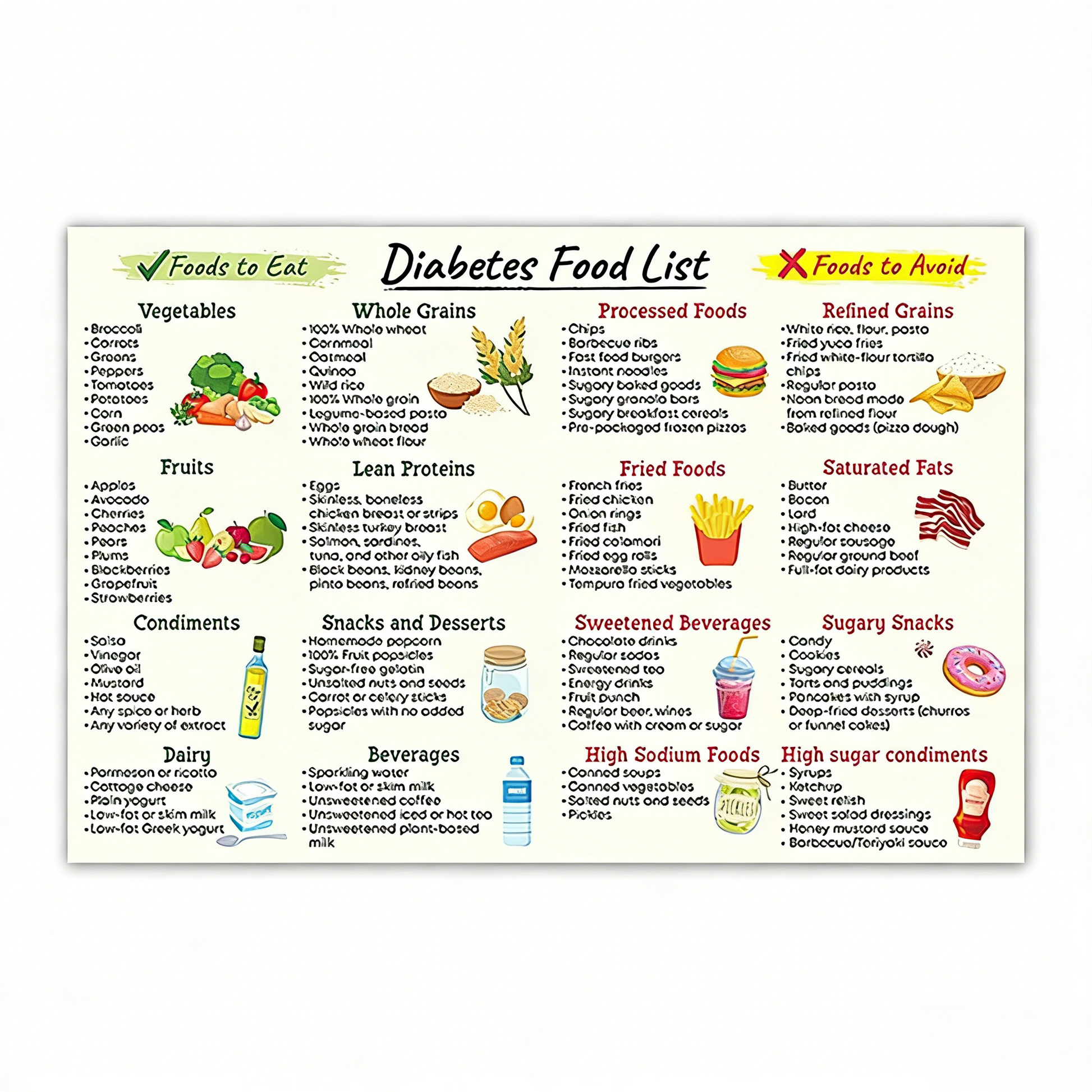 Simplifies diabetes meal planning with clear lists of “Foods to Eat” (beans, non-starchy veggies, whole grains) and “Foods to Avoid” (processed grains, sugary drinks, fried foods).