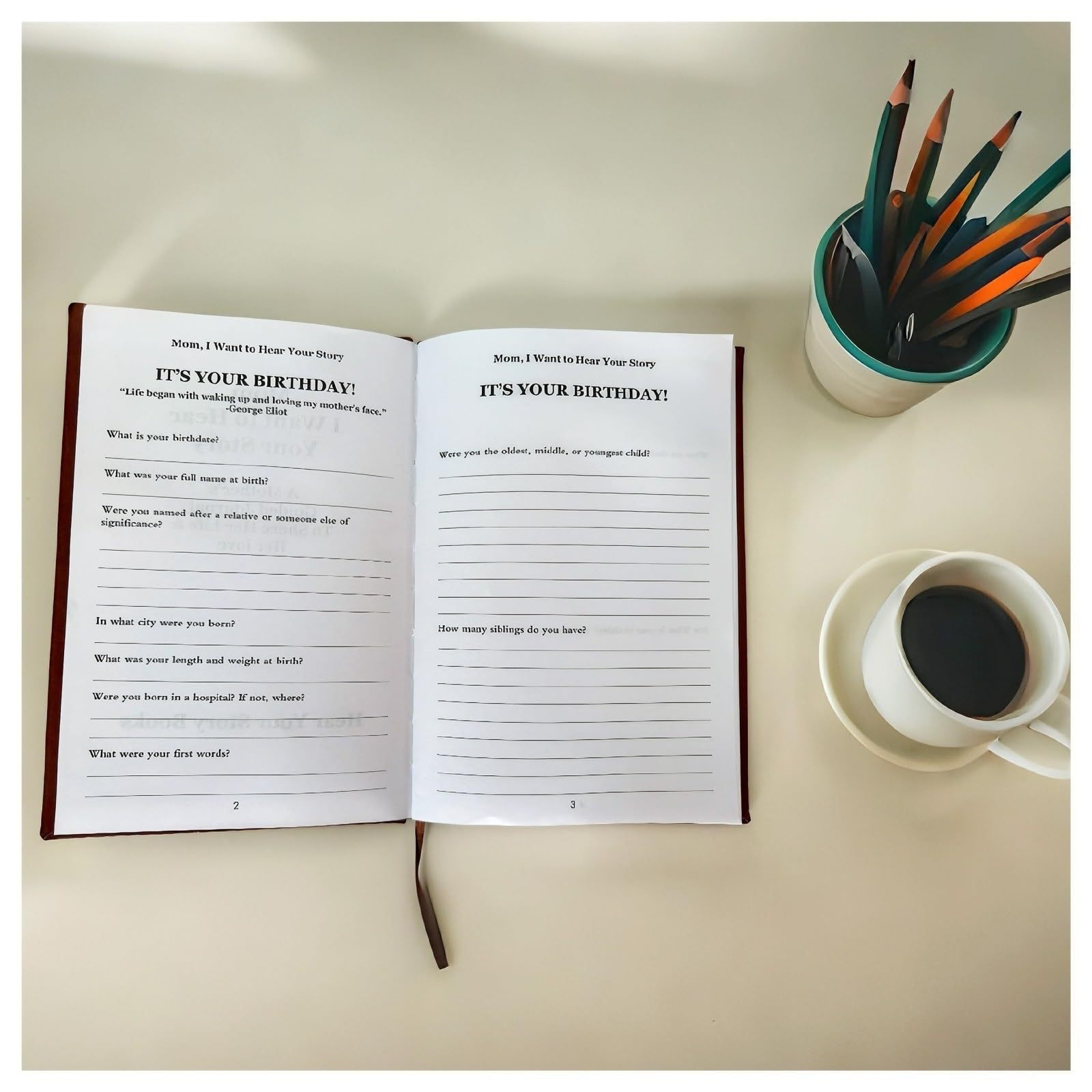 The journal is designed to be completed at their own pace—no deadlines, no pressure. Your parent can write a little each day, or spend a lazy afternoon reminiscing. The prompts are warm and conversational, not formal or intimidating, so they’ll look forward to picking it up again and again.