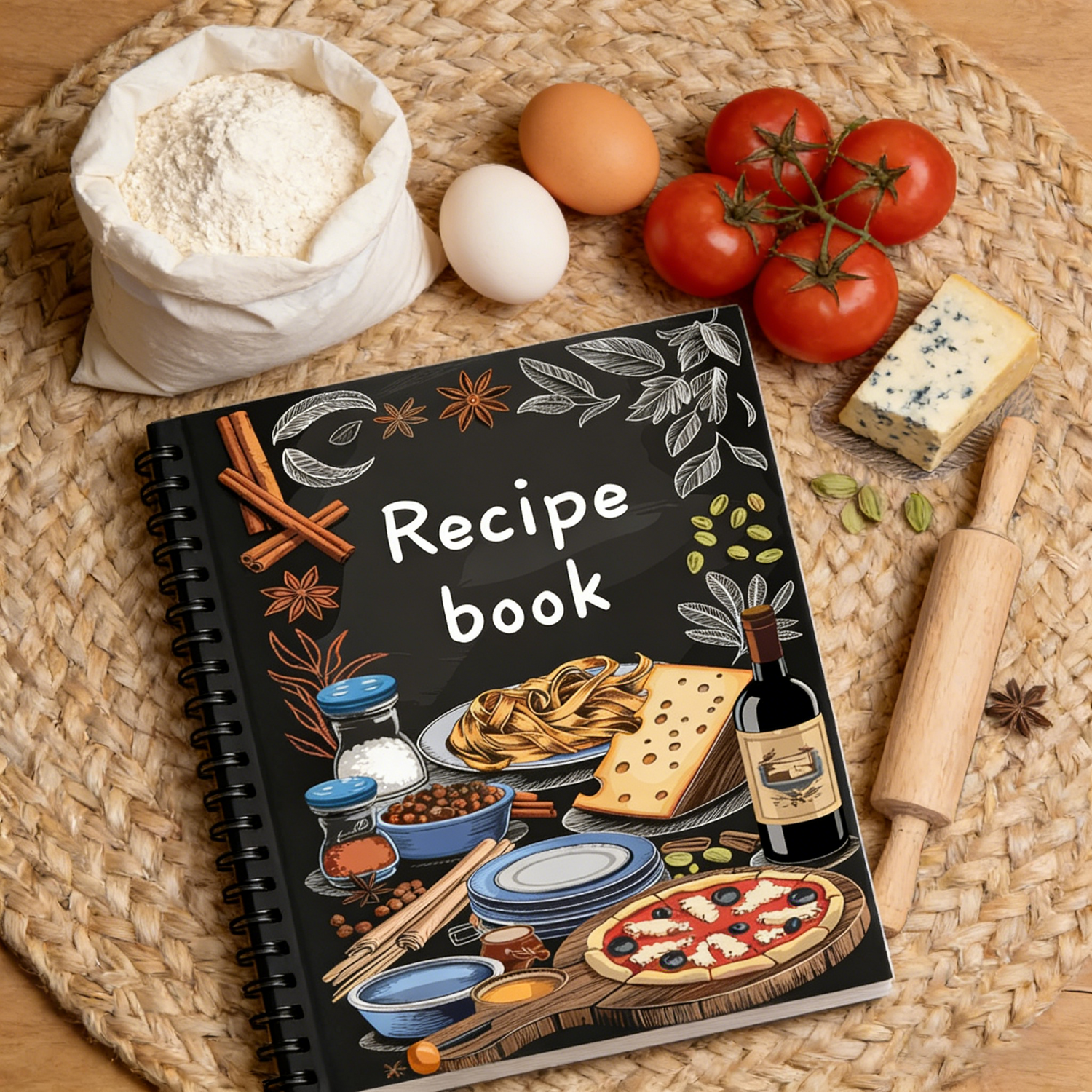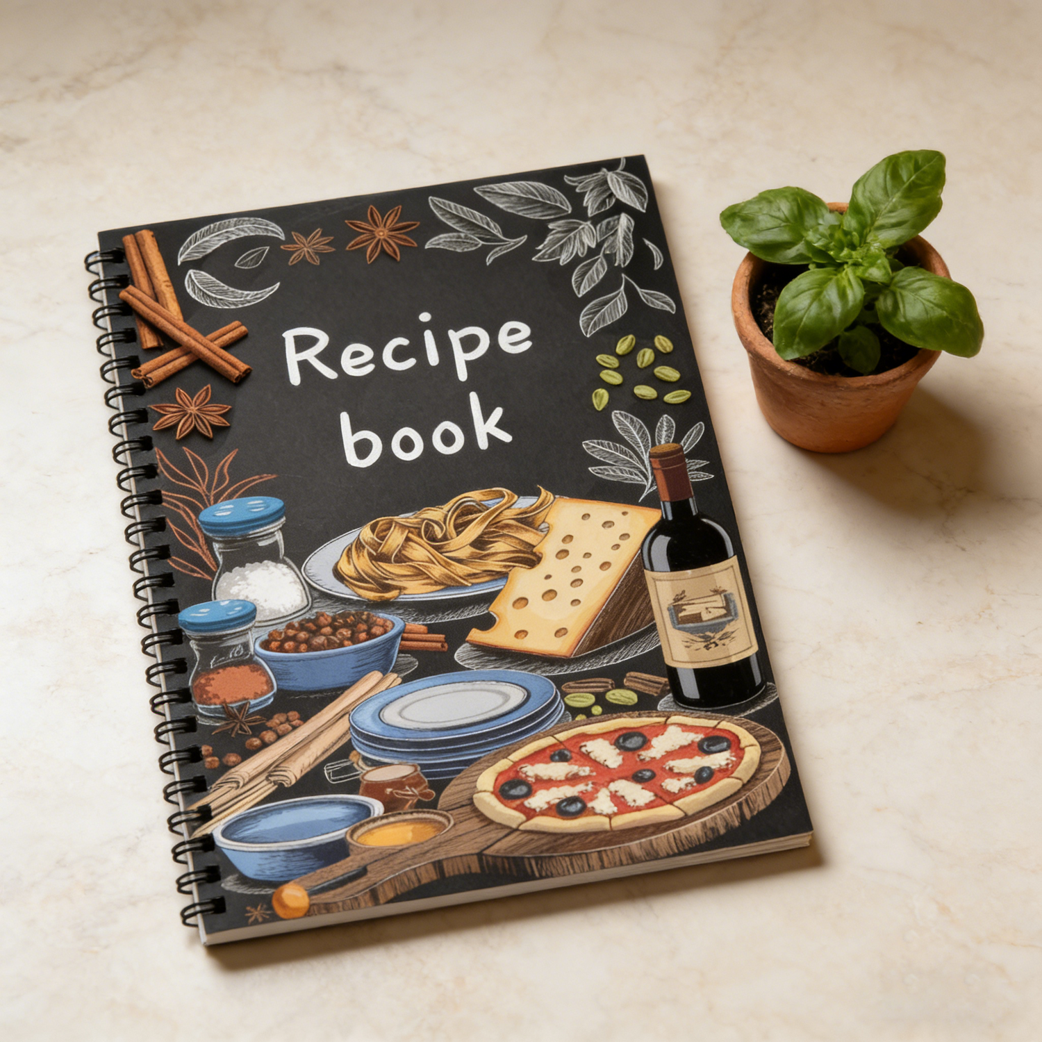 The eye-catching chalkboard-style cover features hand-drawn illustrations of classic ingredients – from aromatic cinnamon sticks and star anise to fresh pasta, artisanal cheese, and a mouthwatering pizza. It’s not just a functional book; it’s a stylish kitchen decor piece that stands out on any shelf.