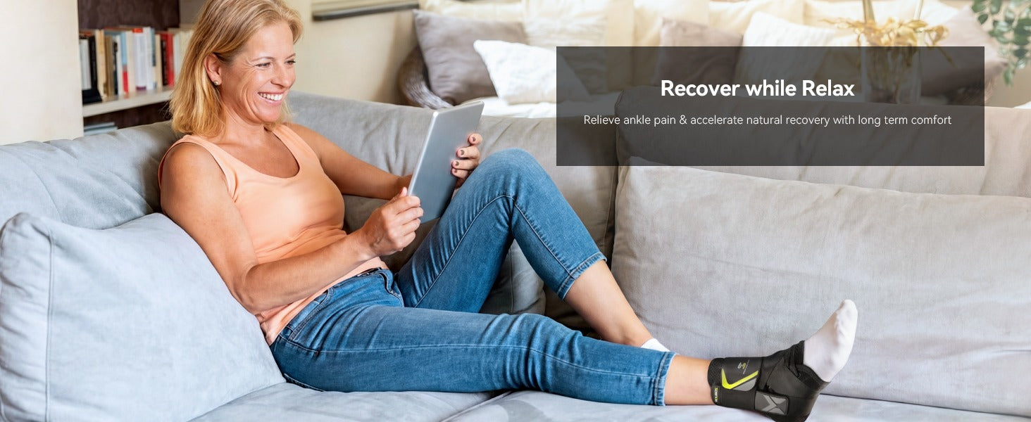 This ankle brace for sprained ankle features three-layer wrapping system (lace closures + figure 8 stabilizing straps + top wrapping), you can adjust the tightness to get comfortable support tailored to your needs. With enough compression, it helps relieve pain and swelling, improves blood circulation, and promotes the natural recovery